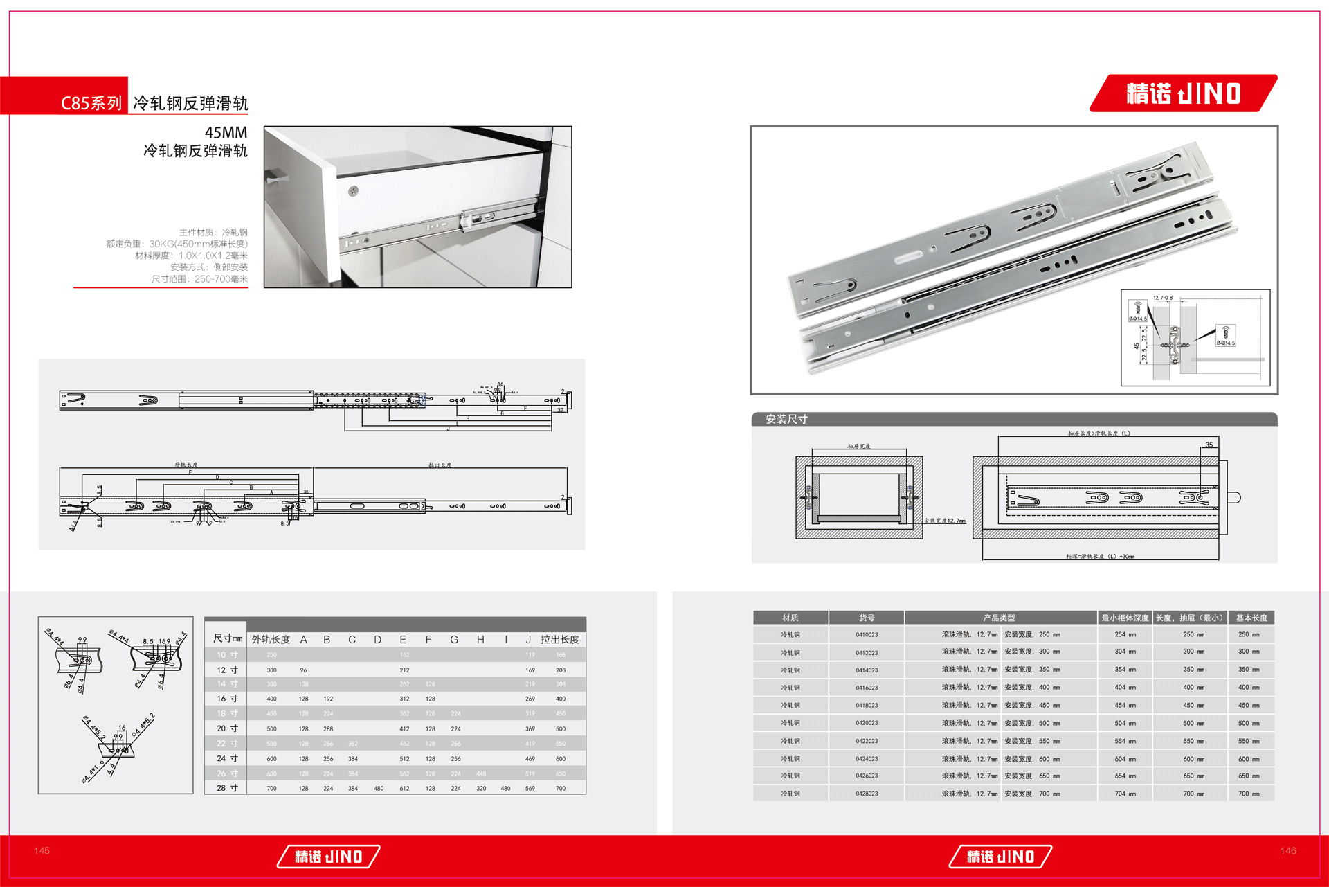 主件材质:冷轧钢 额定负重:30KG(450mm标准长度) 材料厚度:1.0X1.0X1.2毫米 安装方式:侧部安装 尺寸范围:250-700毫米...