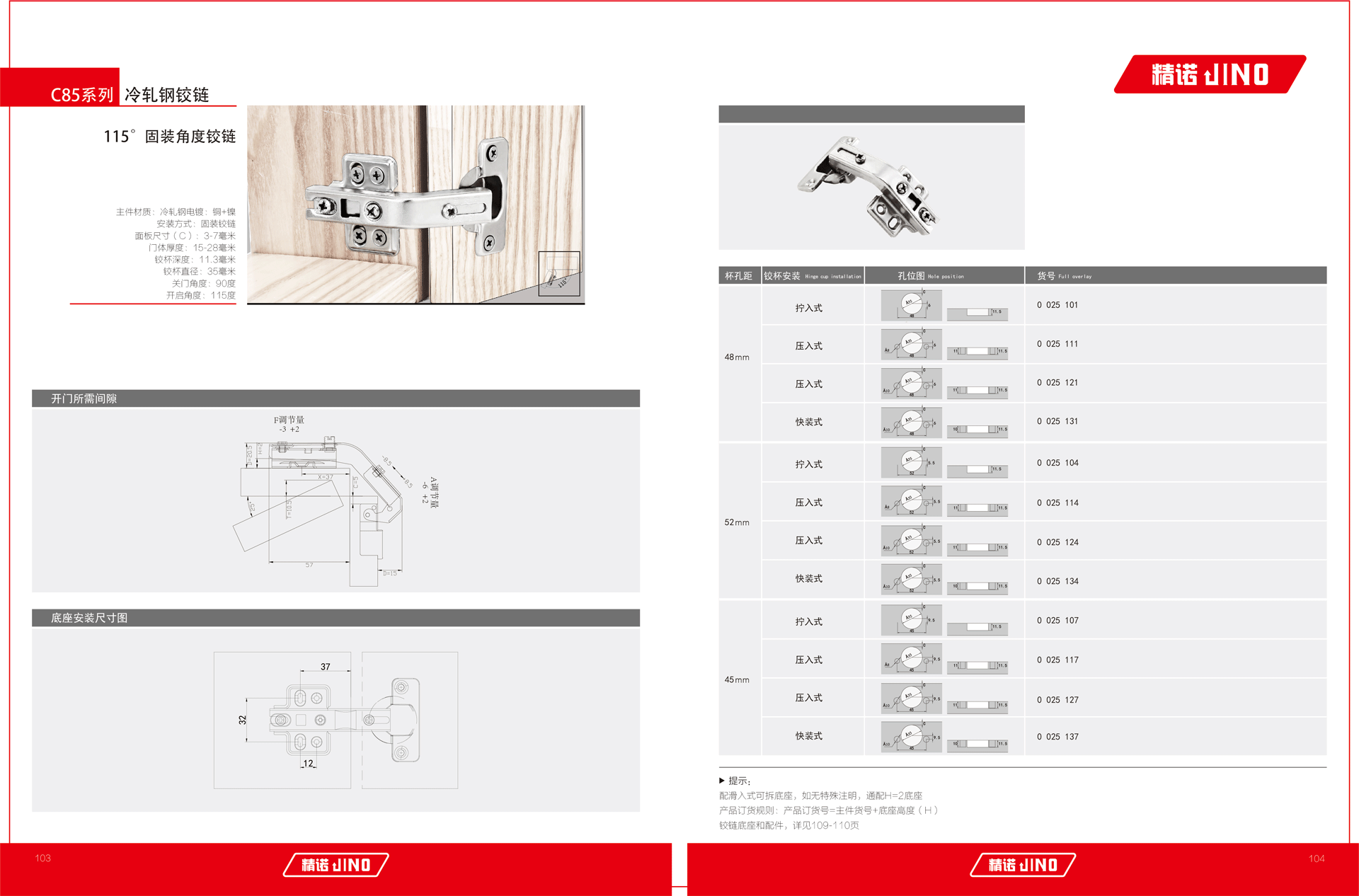 主件材质:冷轧钢电镀:铜+镍 安装方式:固装铰链 面板尺寸(C):3-7毫米 门体厚度:15-28毫米 铰杯深度:11.3毫米 铰杯直径:35毫米 关门角度:90度 开启角度:115度...