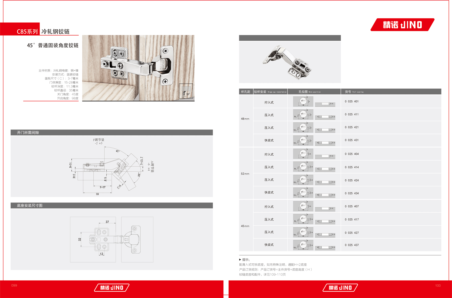 主件材质:冷轧钢电镀:铜+镍 安装方式:固装铰链 面板尺寸(C):3-7毫米 门体厚度:15-28毫米 铰杯深度:11.3毫米 铰杯直径:35毫米 关门角度:45度 开启角度:98度...