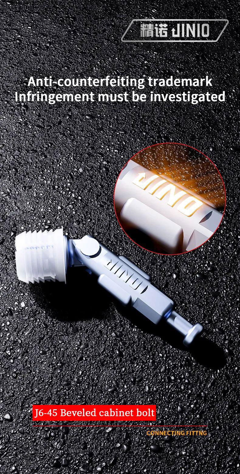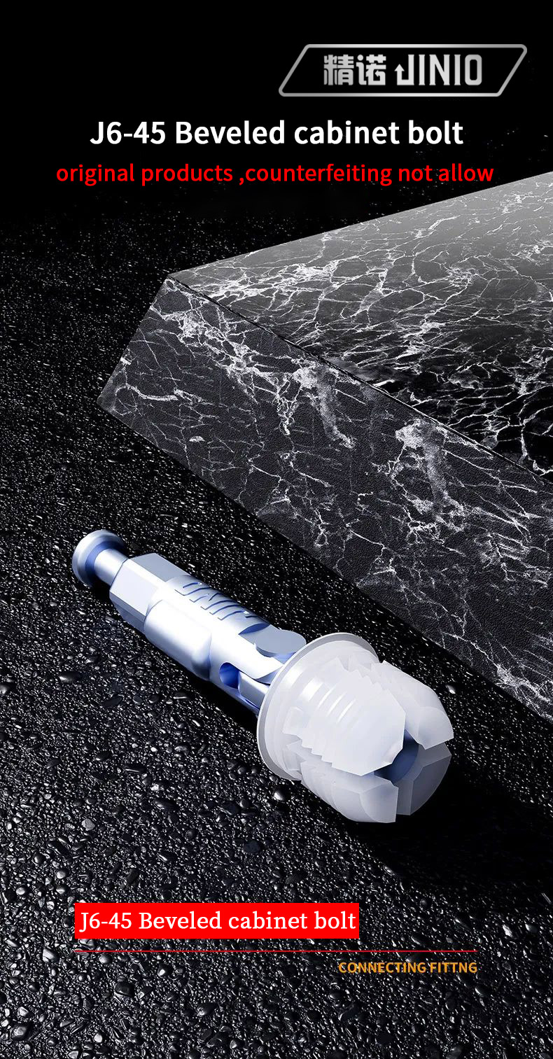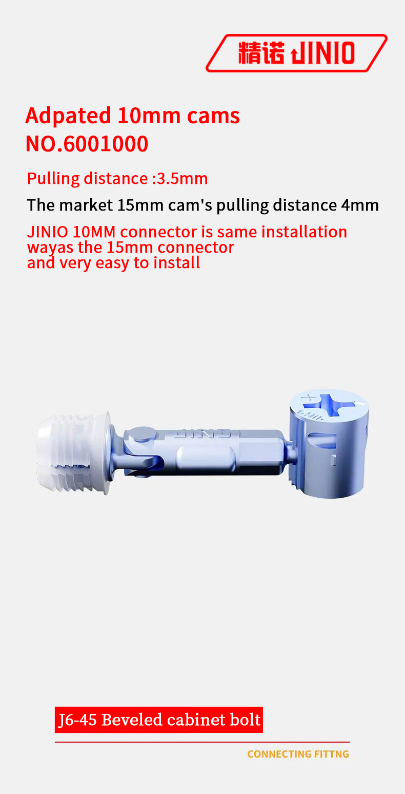 Read 1138 · Date 2022-05-15(1) Beveled cabinet bolt adpated to 10mm cam ,pulling distance :3.5mm ,the market 15mm cam's pulling distance 4mm ,JINIO 10MM connector is same installation way as the 15mm connector ,and very easy to install.(2)Original upper and lower protrusion design, more precise, not misaligned, anti-counterfeiting trademark, infringement must be investigated.(3)Original hexagonal Xuan Feng design with fixed sleeve, more labor-saving and fast installation, improving installation efficiency.