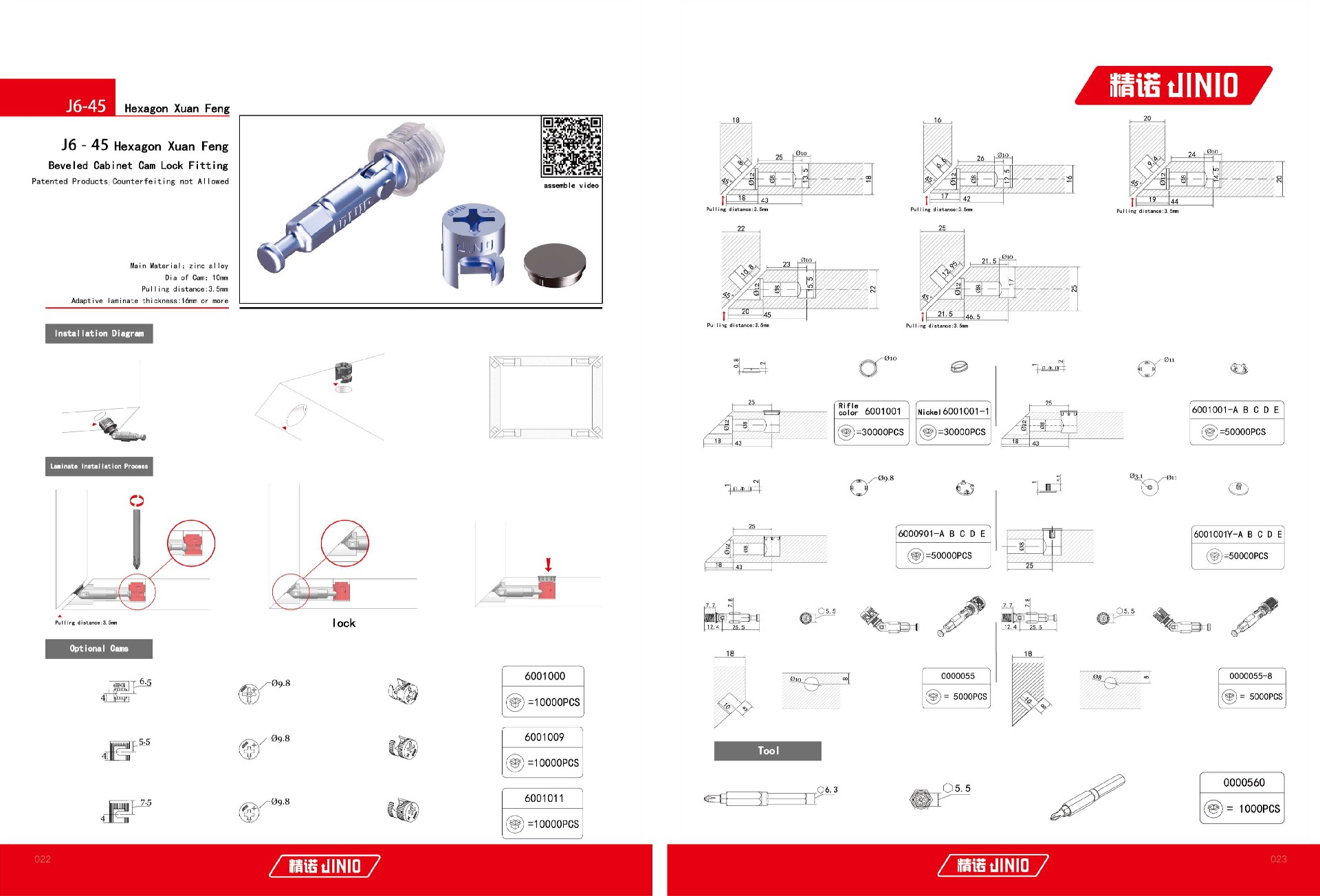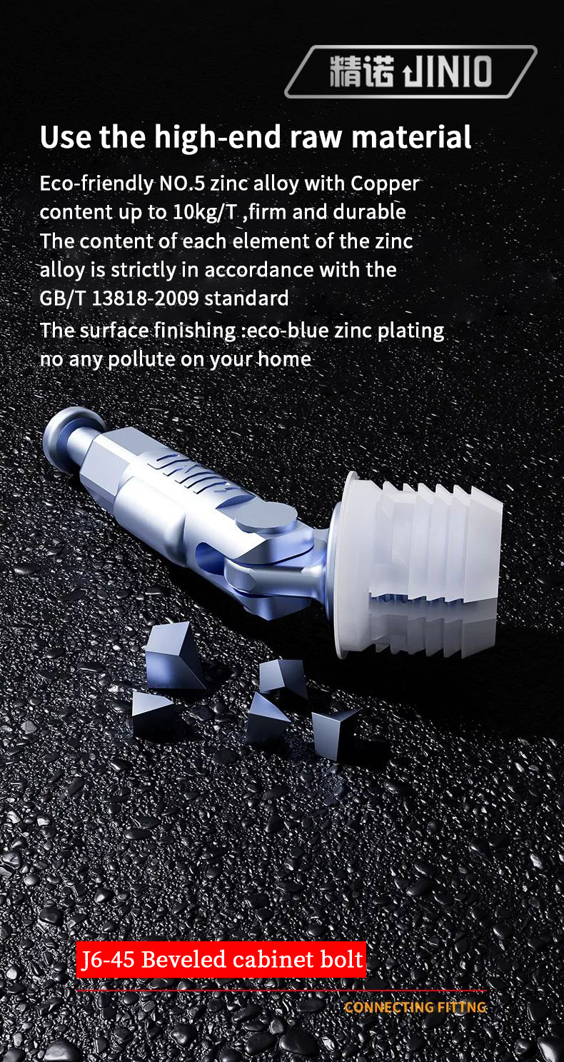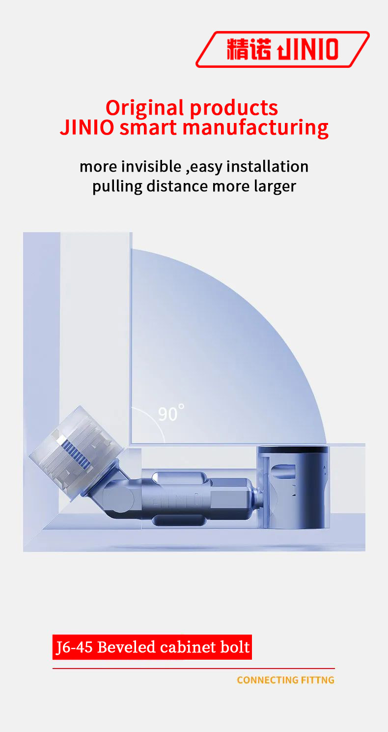 Read 1138 · Date 2022-05-15(1) Beveled cabinet bolt adpated to 10mm cam ,pulling distance :3.5mm ,the market 15mm cam's pulling distance 4mm ,JINIO 10MM connector is same installation way as the 15mm connector ,and very easy to install.(2)Original upper and lower protrusion design, more precise, not misaligned, anti-counterfeiting trademark, infringement must be investigated.(3)Original hexagonal Xuan Feng design with fixed sleeve, more labor-saving and fast installation, improving installation efficiency.