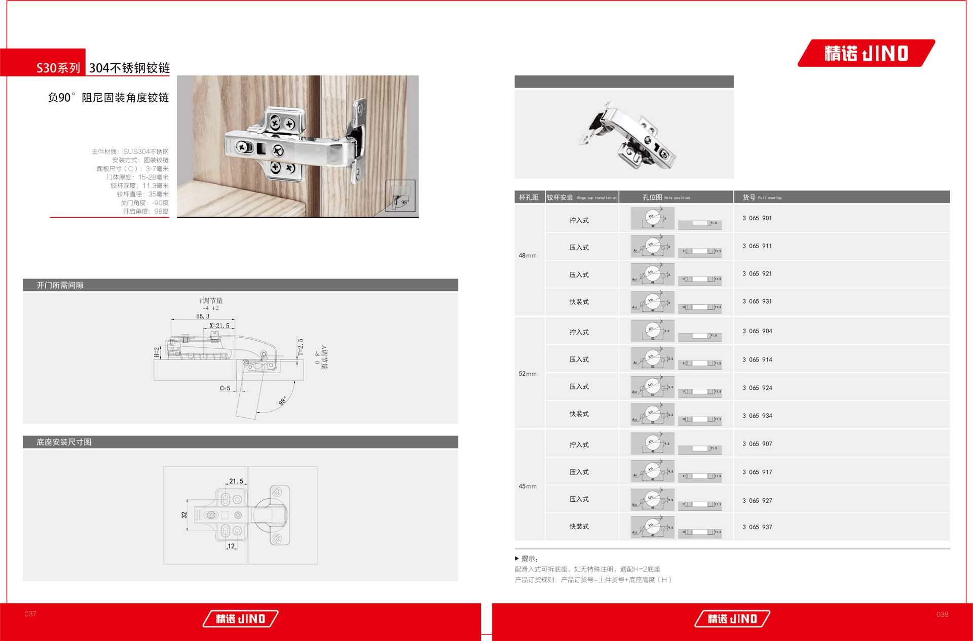 主件材质:SUS304不锈钢 安装方式:固装铰链 面板尺寸(C):3-7毫米 门体厚度:15-28毫米 铰杯深度:11.3毫米 铰杯直径:35毫米 关门角度:-90度 开启角度:98度...