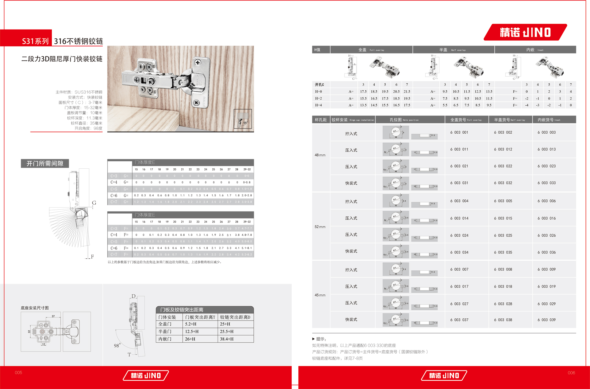 主件材质:SUS316不锈钢 安装方式:快装铰链 面板尺寸(C):3-7毫米 门体厚度:15-32毫米 盖板调节量:10毫米 铰杯深度:11.3毫米 铰杯直径:35毫米 开启角度:98...