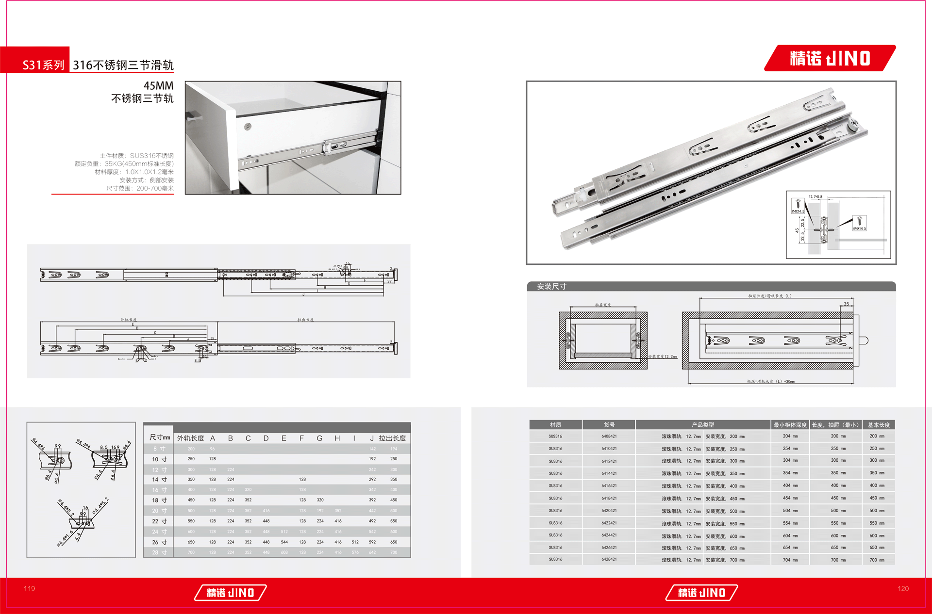316 45MM 不锈钢三节轨