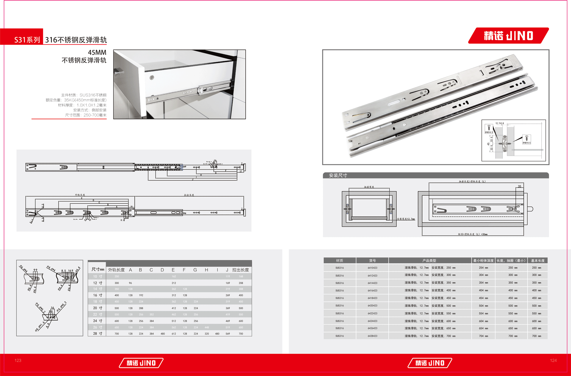 主件材质:SUS316不锈钢 额定负重:35KG(450mm标准长度) 材料厚度:1.0X1.0X1.2毫米 安装方式:侧部安装 尺寸范围:250-700毫米...