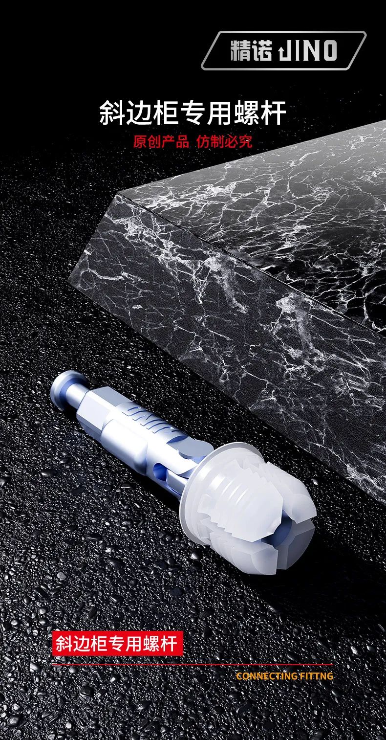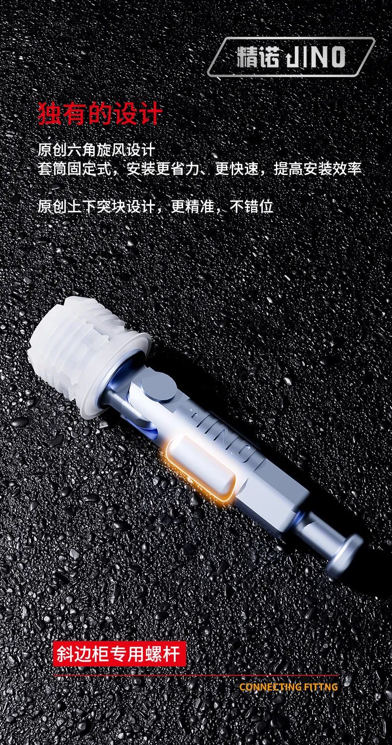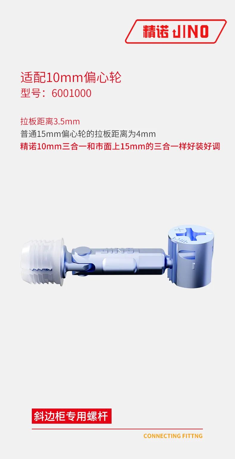 阅读 6853 · 发布日期 2022-06-04(1)斜边柜专用螺杆适配10mm偏心轮,拉板距离3.5mm,普通15mm偏心轮的拉板距离为4mm,精诺10mm三合一跟市面的15mm三合一一样非常好调好安装。(2)原创上下突块设计,更精准,不错位。防伪商标,侵权必究! (3)原创六角旋风设计,套筒固定式,安装更省力、更快速,提高安装效率。