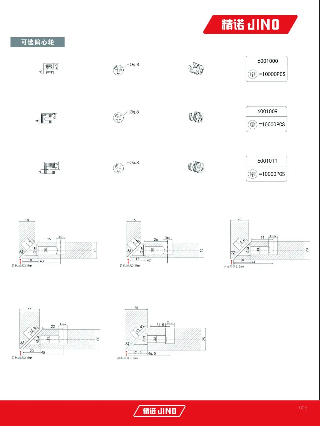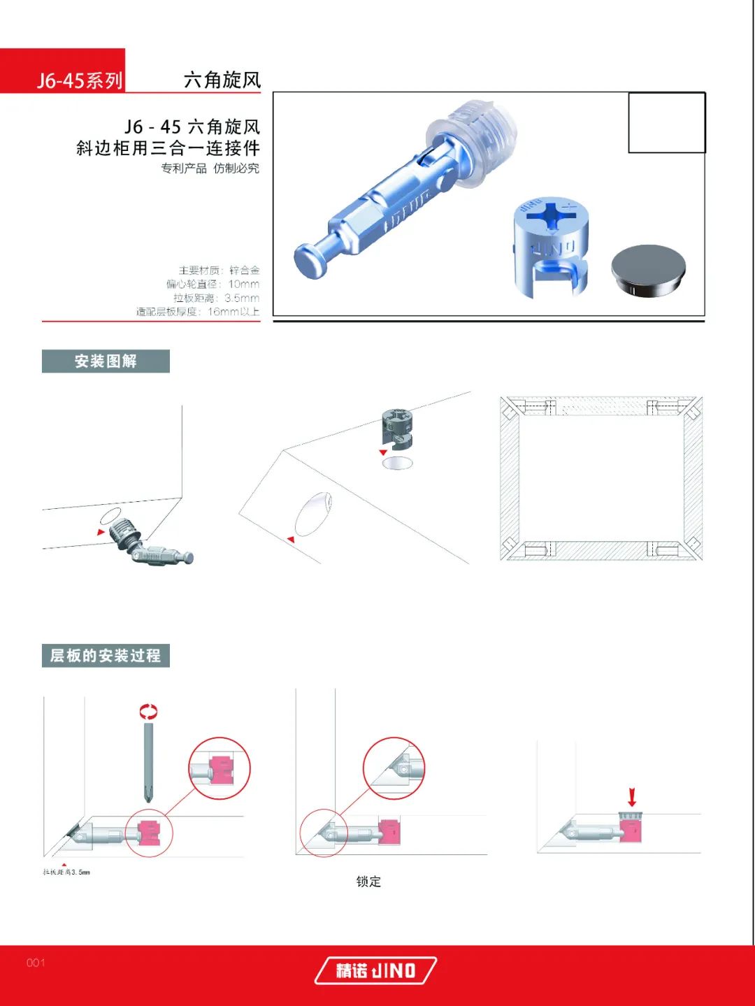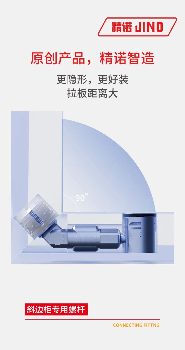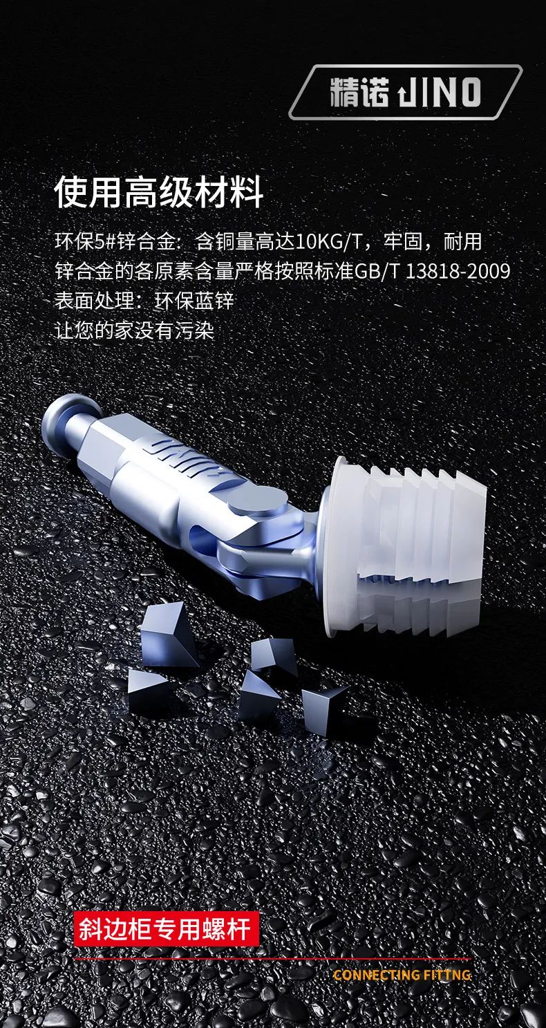 阅读 6853 · 发布日期 2022-06-04(1)斜边柜专用螺杆适配10mm偏心轮,拉板距离3.5mm,普通15mm偏心轮的拉板距离为4mm,精诺10mm三合一跟市面的15mm三合一一样非常好调好安装。(2)原创上下突块设计,更精准,不错位。防伪商标,侵权必究! (3)原创六角旋风设计,套筒固定式,安装更省力、更快速,提高安装效率。