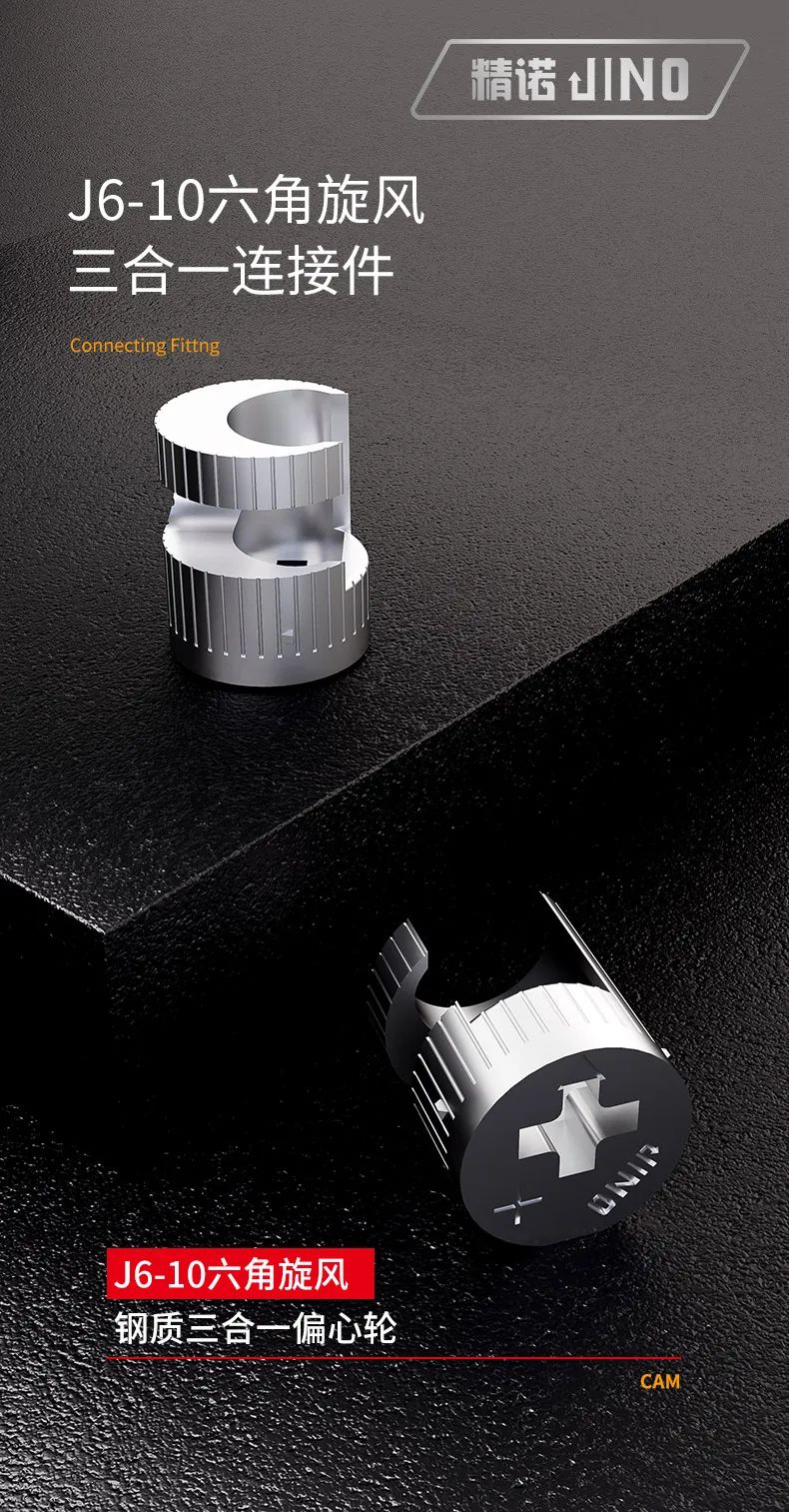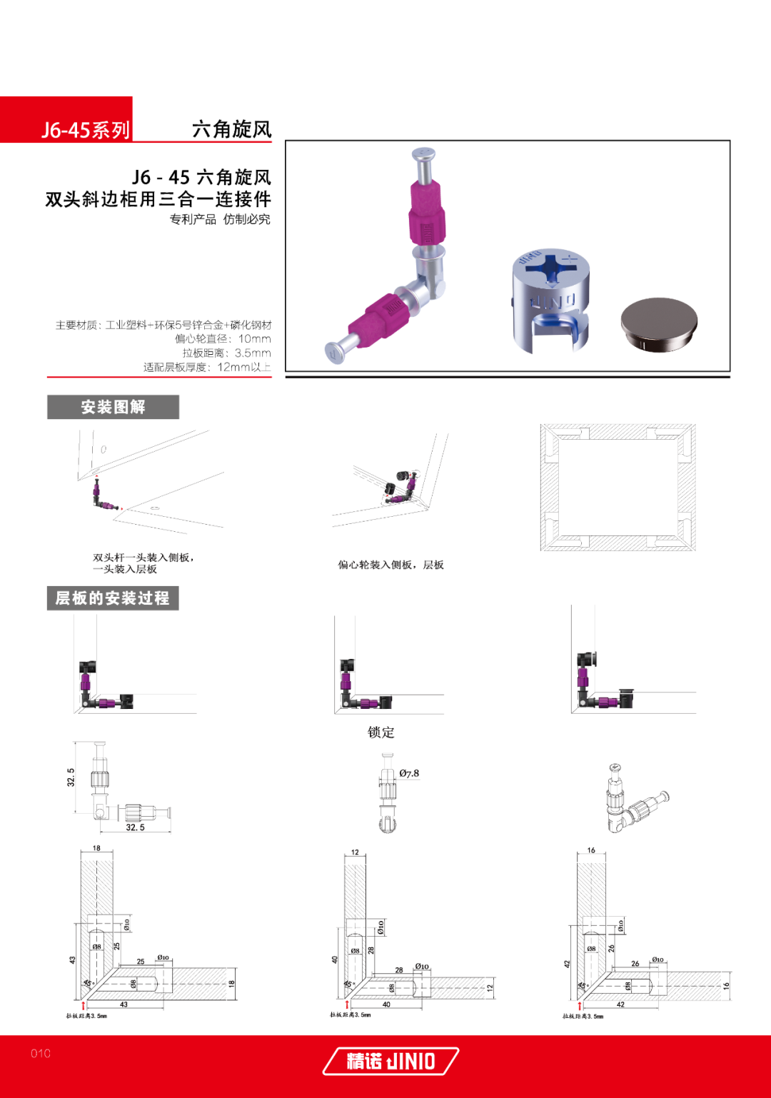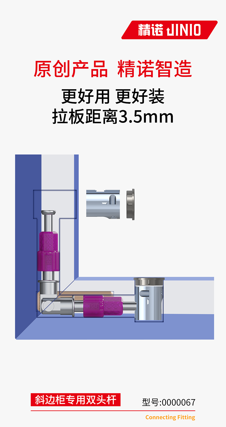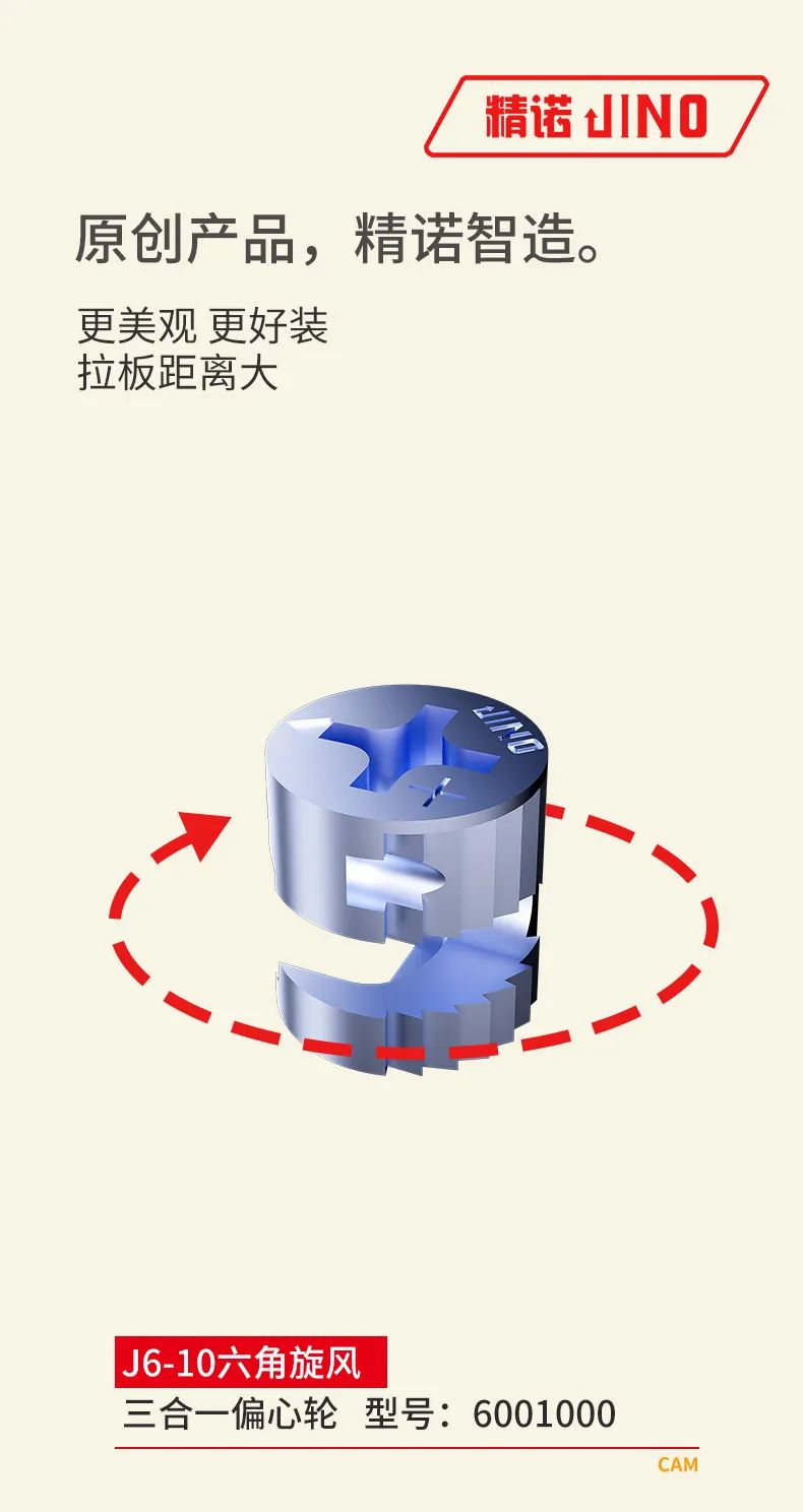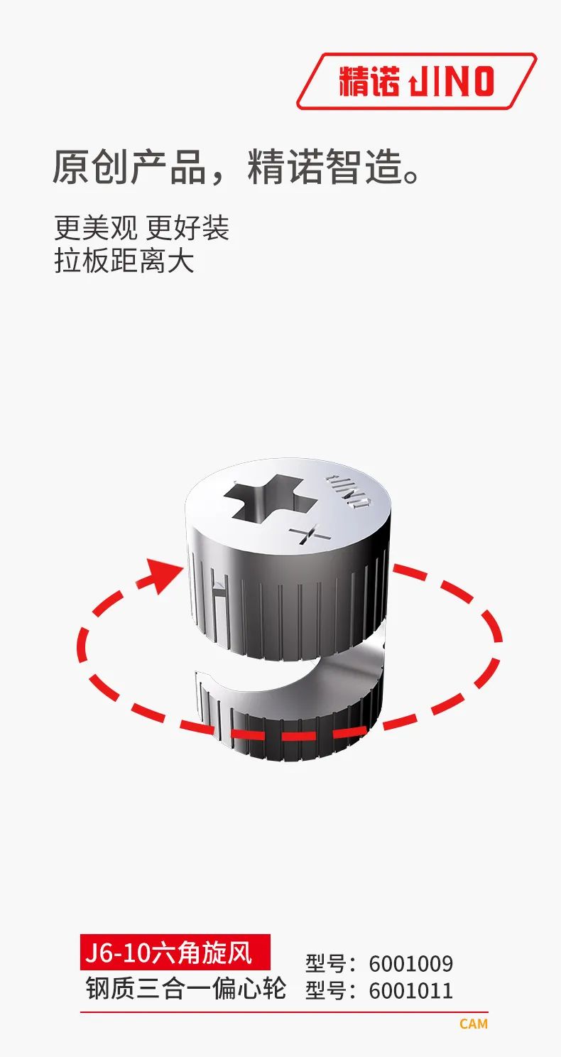 阅读 3741 · 发布日期 2023-07-01(1)斜边柜用双头螺杆适配10mm偏心轮,拉板距离达到3.5mm: 基本达到市面15mm偏心轮的调节量; (2)斜边柜用双头螺杆适用90°-270°的异形柜体连接。并且开孔不改变原有工艺,更为方便快捷; (3)原创六角旋风设计,套筒固定式,安装更省力、更快速,提高安装效率。